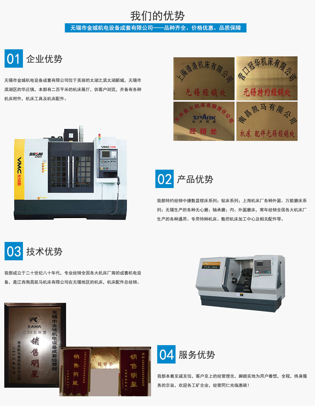 無錫市金城機電設備成套有限公司位于美麗的太湖之濱太湖新城,無錫市濱湖區(qū)的華莊鎮(zhèn),本部有二百平米的機床展廳,供客戶瀏覽,并備有各種機床附件,機床工具及機床配件。 我部成立于二十世紀八十年代,專業(yè)經銷全國各大機床廠商的成套機電設備,是江西南昌凱馬機床有限公司在無錫地區(qū)的機床,機床配件總經銷。系蘭州里海機床有限公司,天水星火...